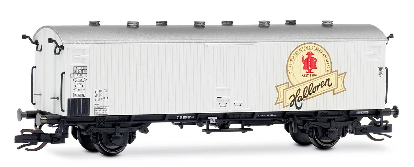 | chladící nákladní vůz v barvě slonová kost se stříbrnou střechou „Halloren“ |