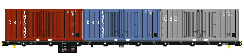 | nákladní plošinový vůz černý se třemi kontejnery 20' „ČSD INTRANS“ |