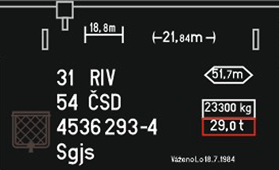 | • 31 54 4536 293-4 | → | nákladní, s podvozky, pevný rozchod, ve vlastnictví železniční správy, RIV, PPV |
