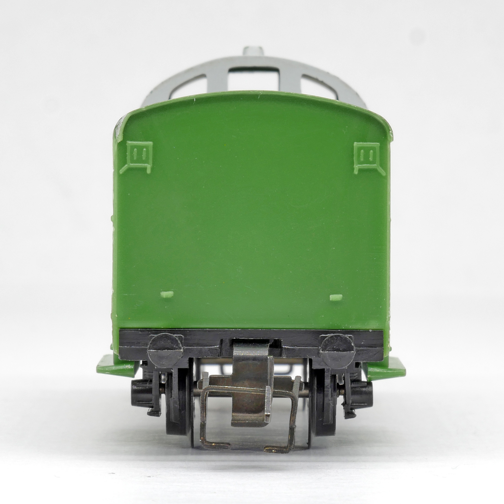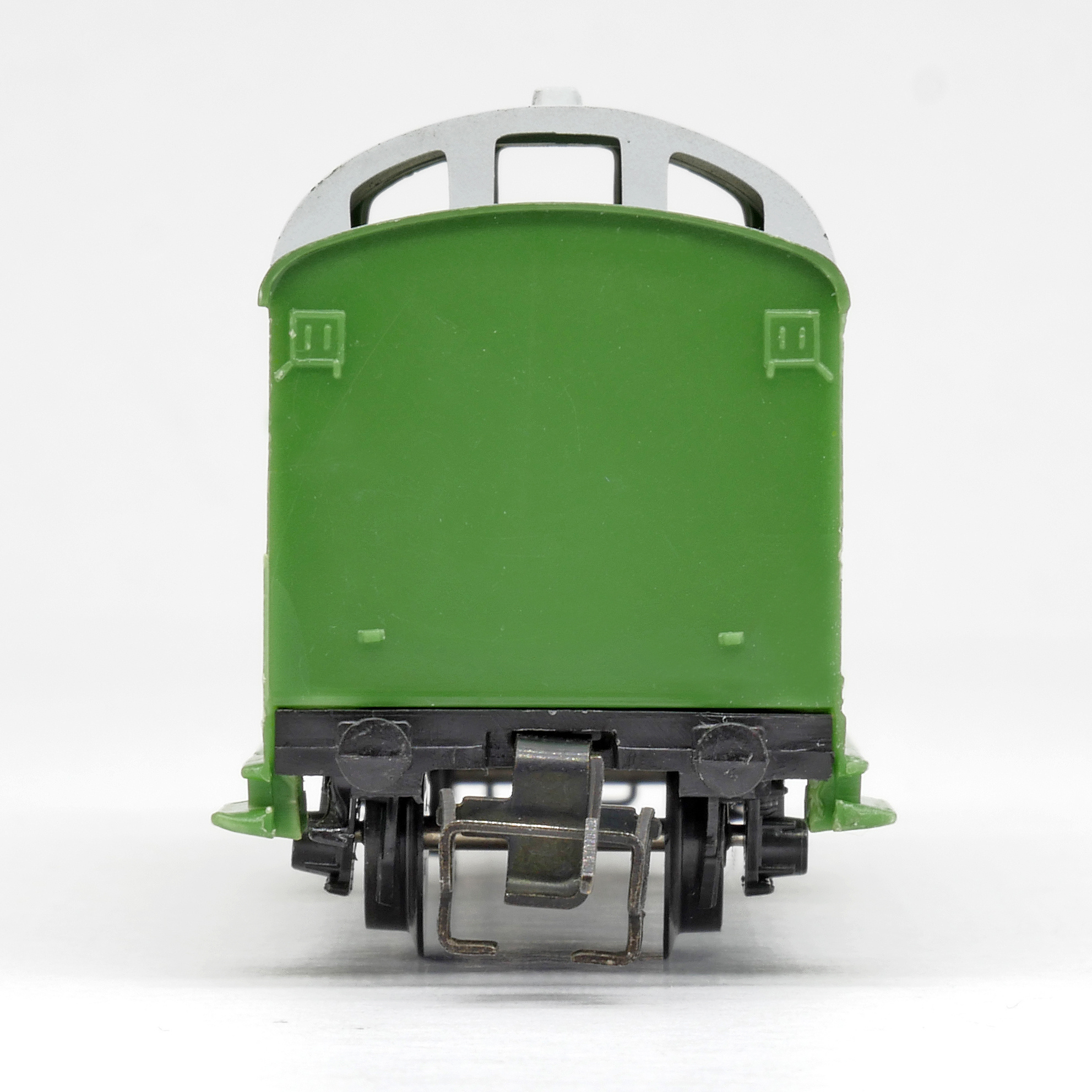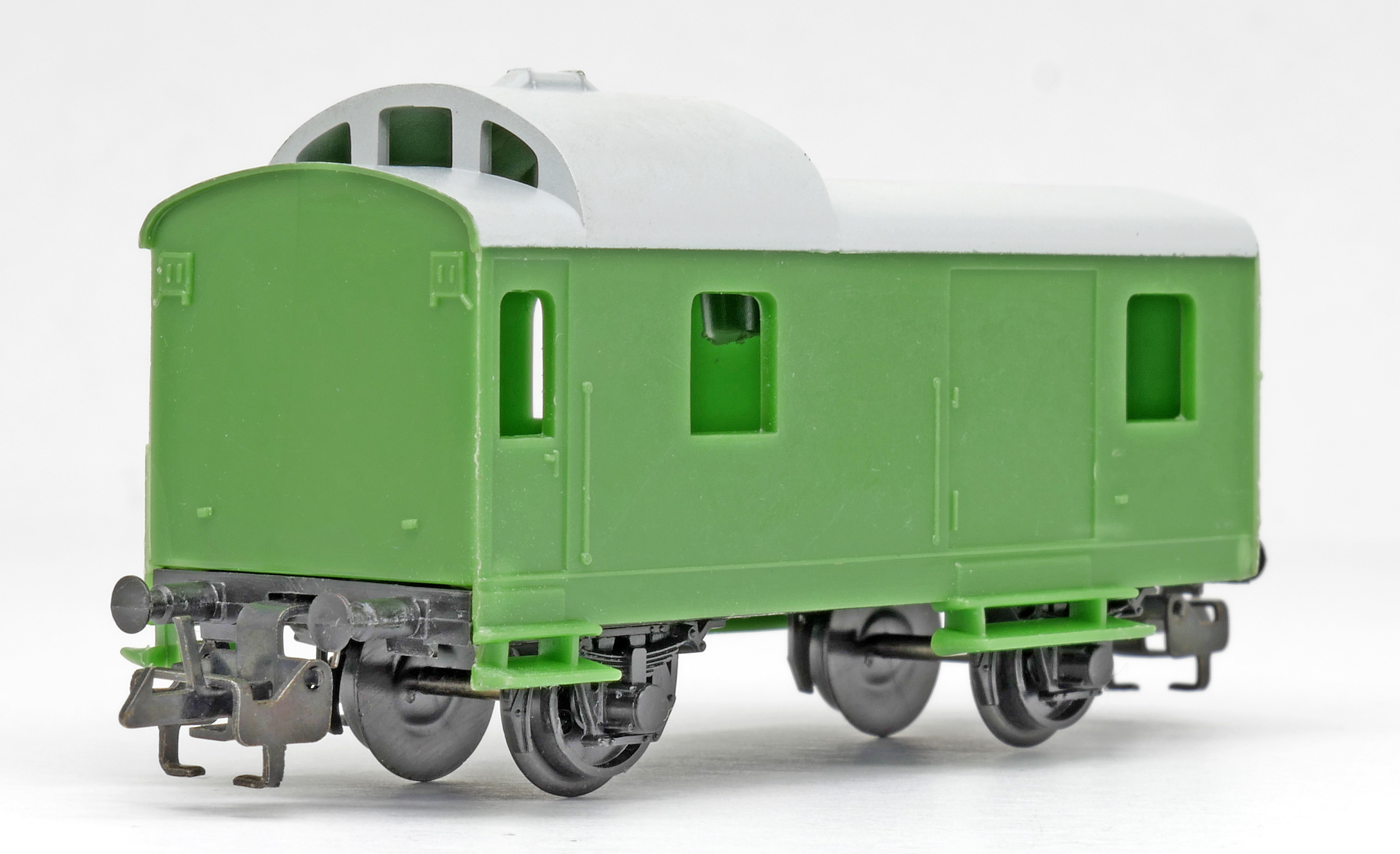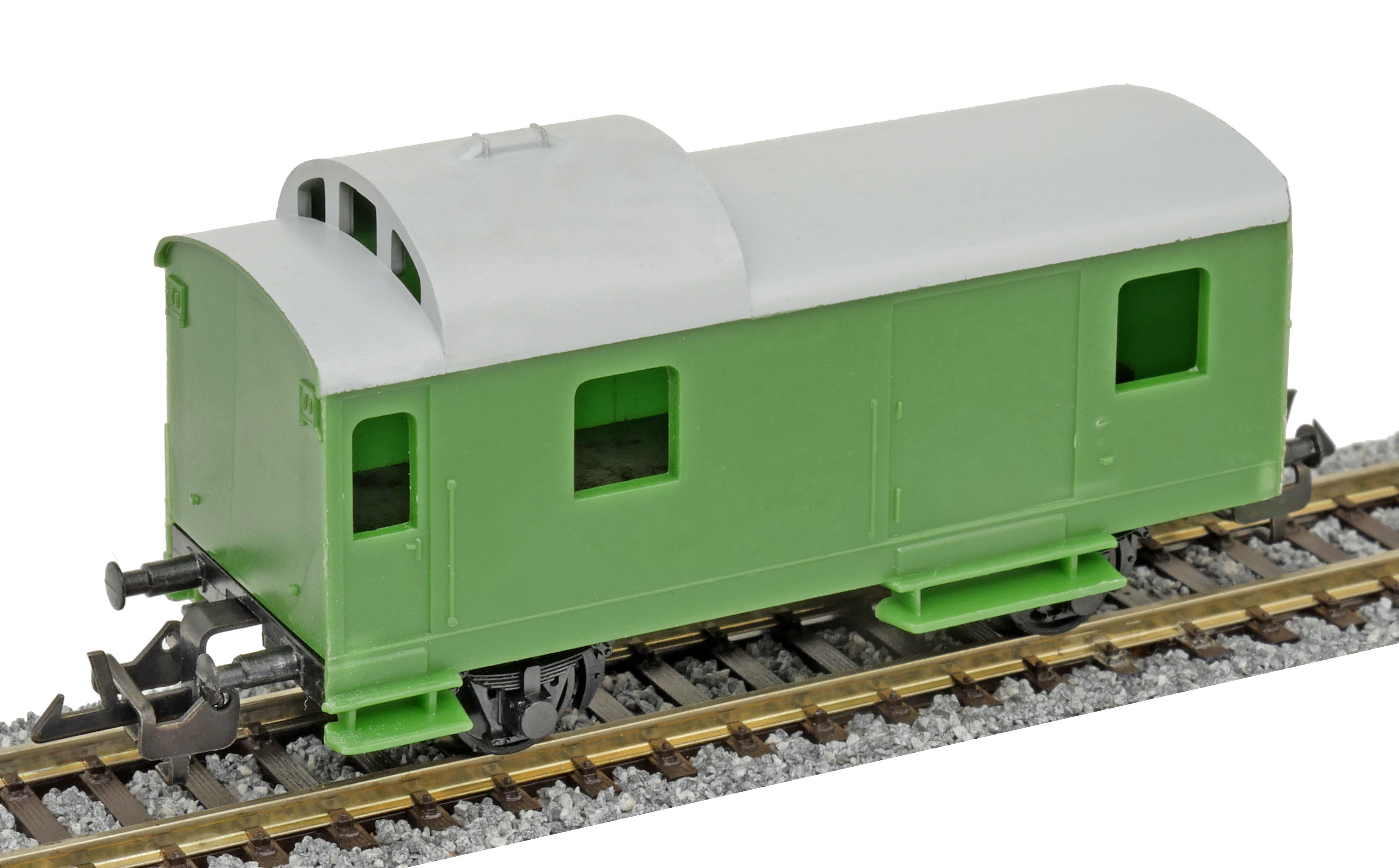 | služební vůz pro nákladní vlaky zelený v barvě plastu s šedou střechou |