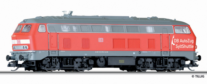 | dieselová lokomotiva červená s šedou střechou „Sylt-Shuttle“ |