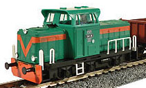 dieselová lokomotiva zelená-oranžová s černým rámem a pojezdem