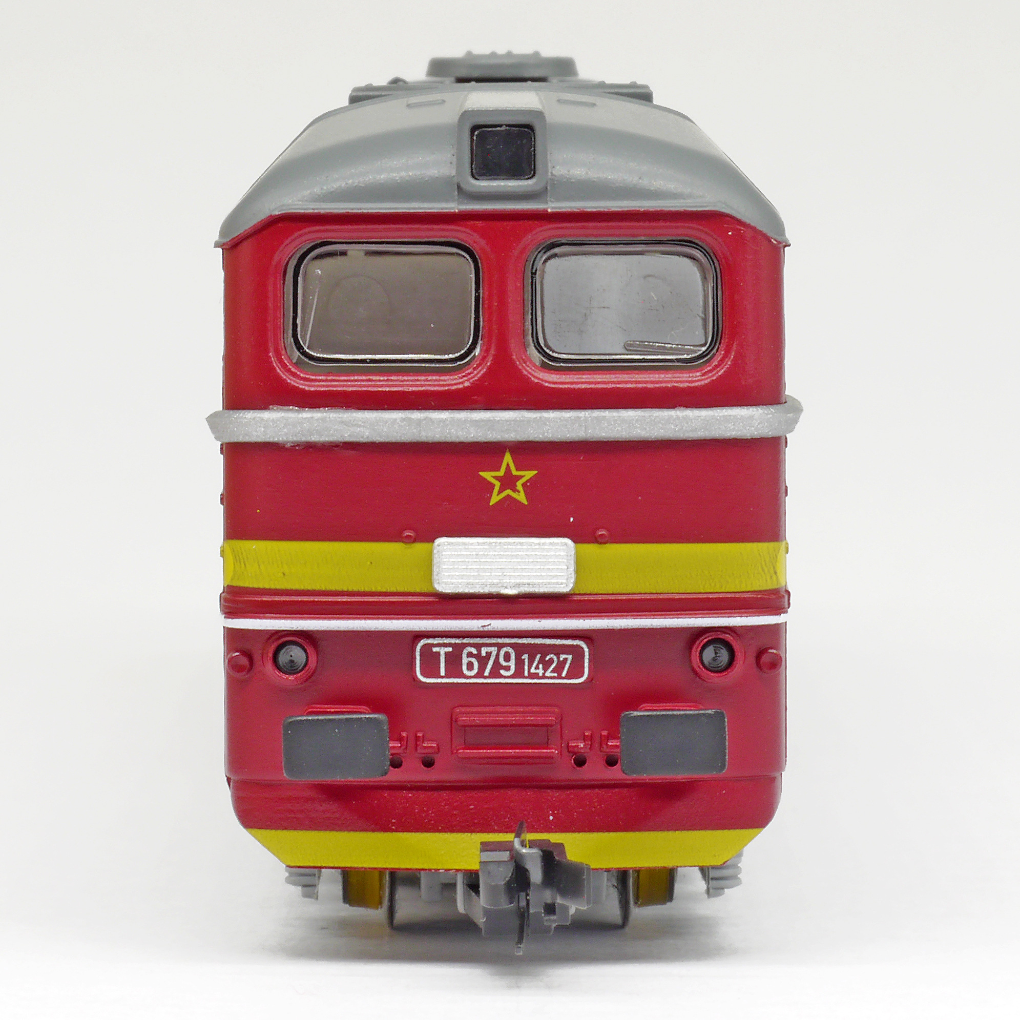 | dieselová lokomotiva červená s šedým pojezdem a výstražným žlutým pruhem |