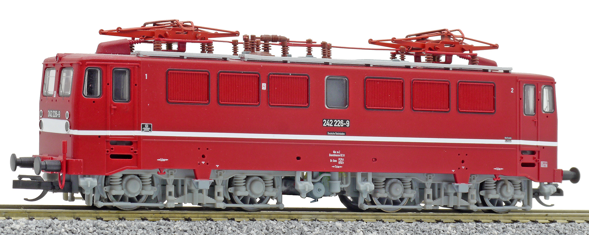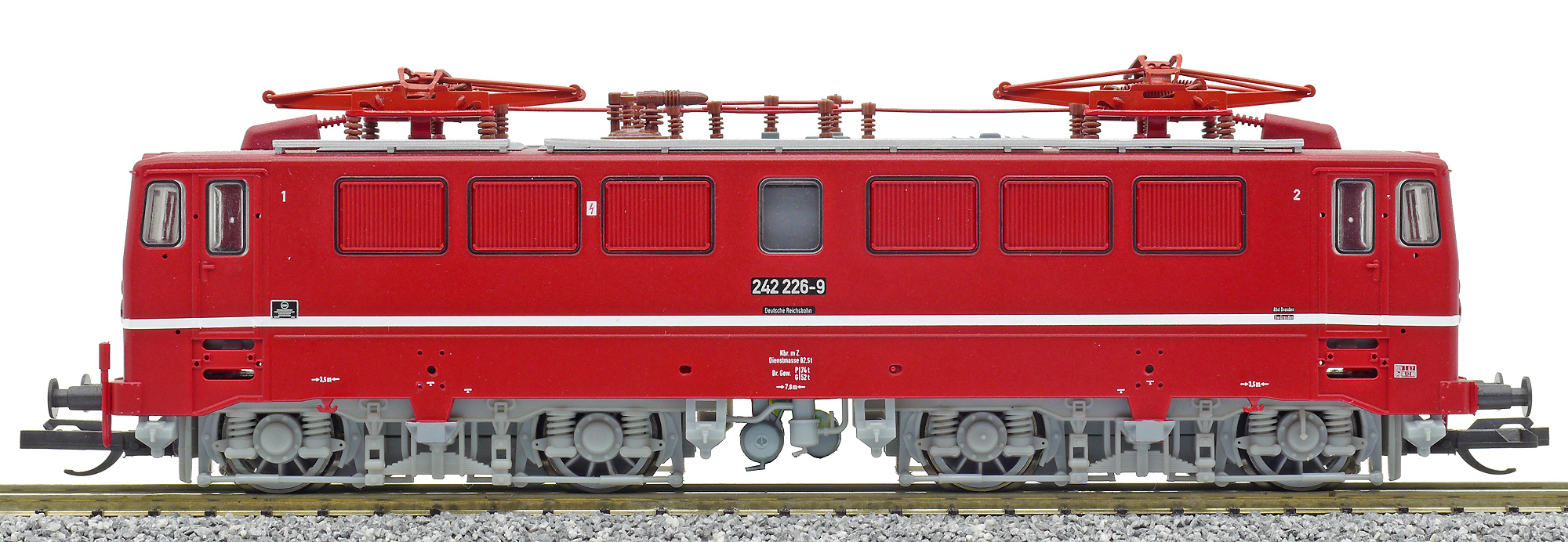 Kód   500228  [Lokomotivy] → [Elektrické] → [BR 242] → 500228: elektrická lokomotiva červená s bílou linkou a šedými podvozky