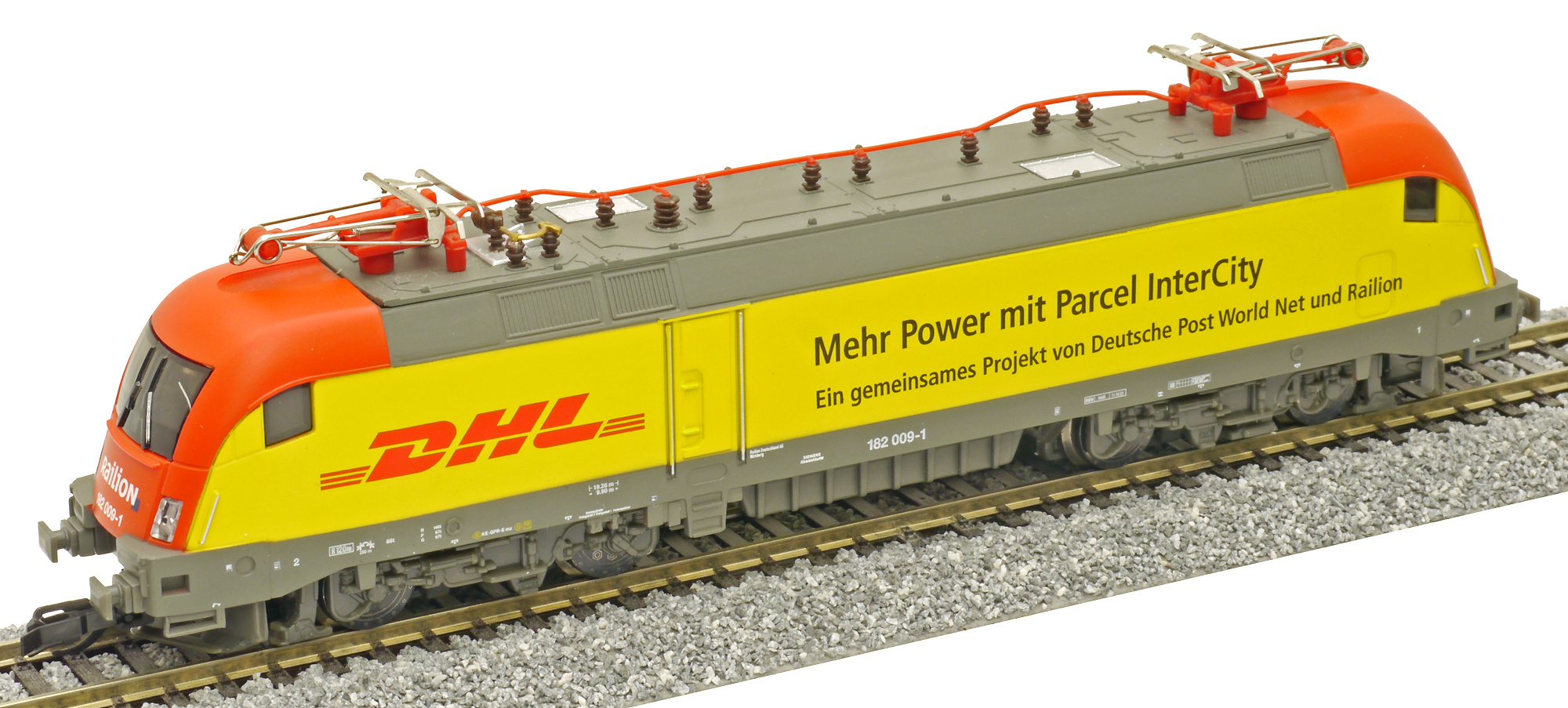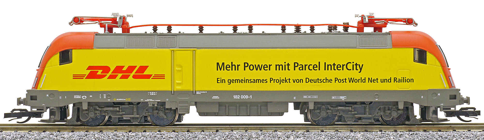 | elektrická lokomotiva žlutá s červenými čely, šedý rám „DHL“ |
