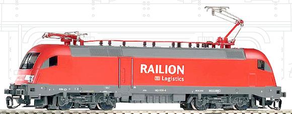 Popis   elektrická lokomotiva červená s šedým rámem „Railion-Logistic“
