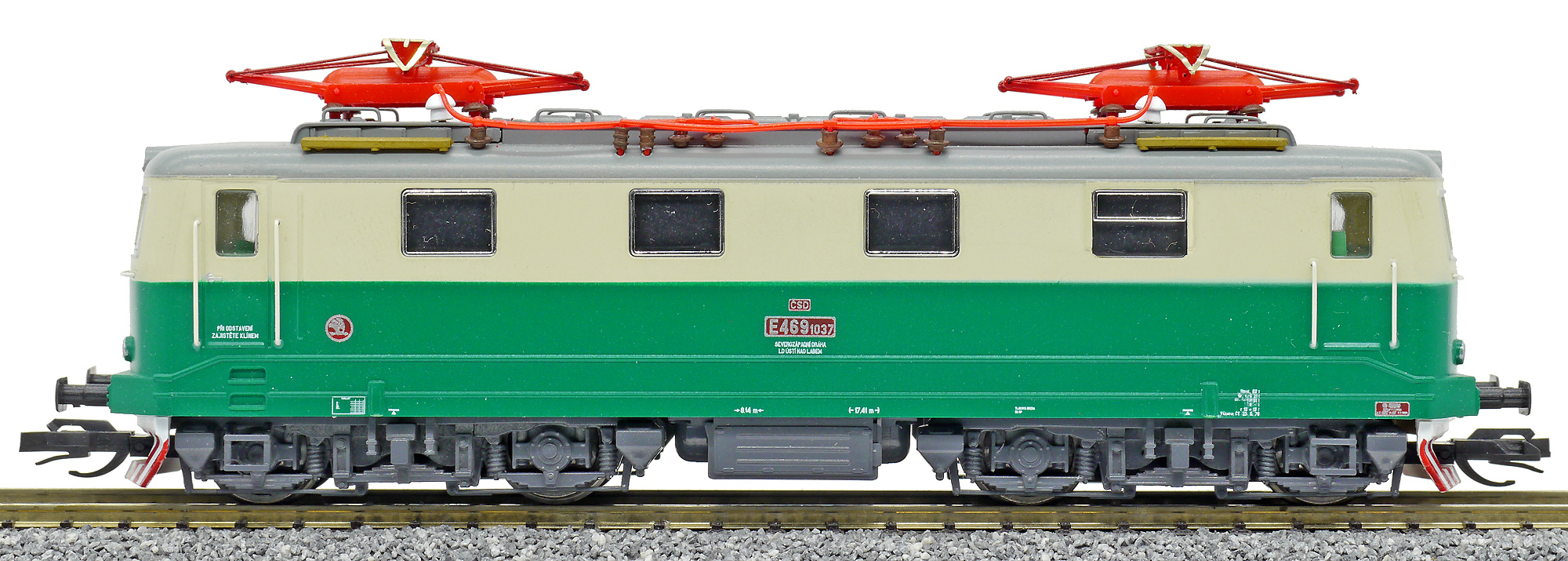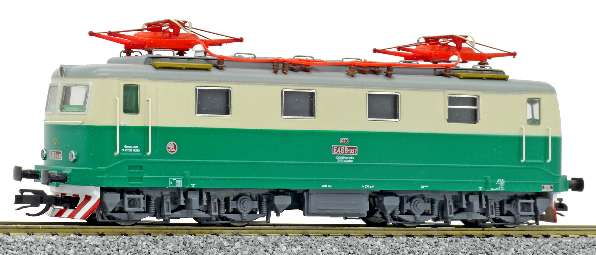 Kód   CD-141-046  [Lokomotivy] → [Elektrické] → [E499.1/E469.1] → CD-141-046: elektrická lokomotiva zelená-slonová kost, šedá střecha, oranžový výstražný pruh