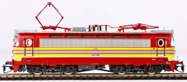| elektrická lokomotiva v barevné kombinaci červená-žlutá, šedá střecha |