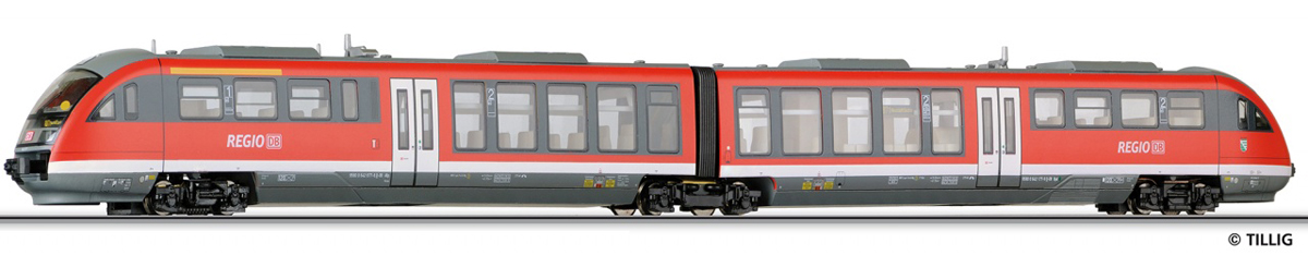 | motorová jednotka červená s šedou střechou a pojezdem, logo „DB-Regio“ |