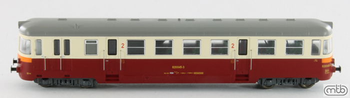 Popis   motorový vůz červený-slonová kost s šedou střechou, výstražný pruh na čelech