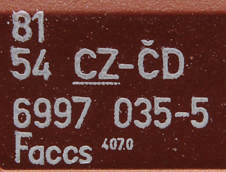 | • 81 54 6997 035-5 | → | nákladní, s podvozky, ve vlastnictví železniční správy, pro mezinárodní dopravu dle zvláštních umluv |