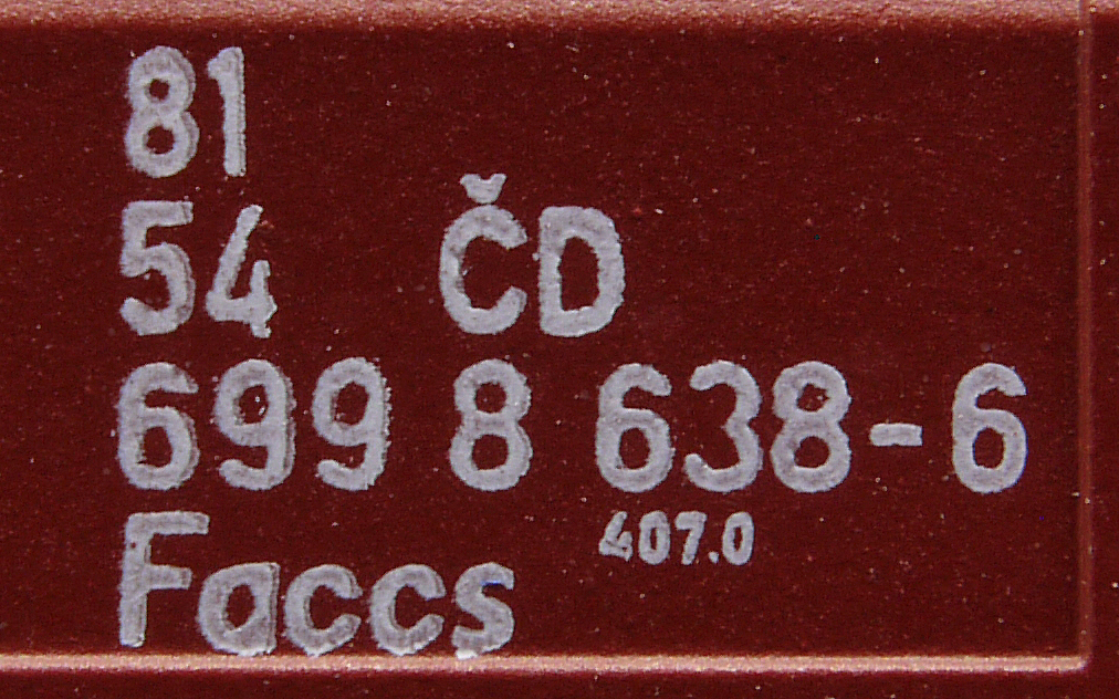 | • 81 54 699 8 638-6 | → | nákladní, s podvozky, ve vlastnictví železniční správy, pro mezinárodní dopravu dle zvláštních umluv |