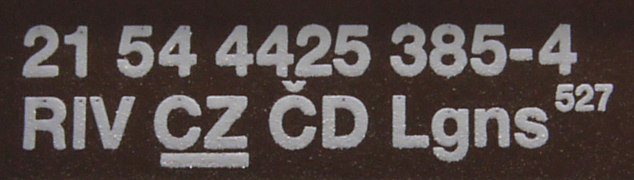 | • 21 54 4425 385-4 | → | nákladní, nezávislé nápravy, pevný rozchod, ve vlastnictví železniční správy, RIV, PPV |