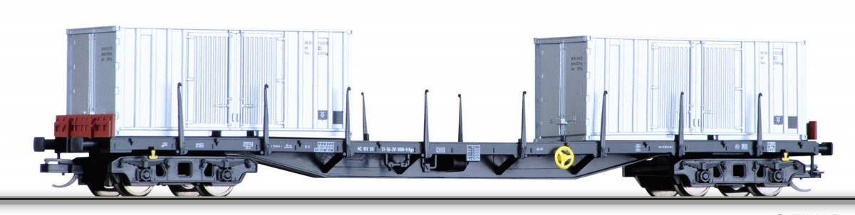 | nákladní plošinový vůz černý s nákladem dvou kontejnerů 20' |