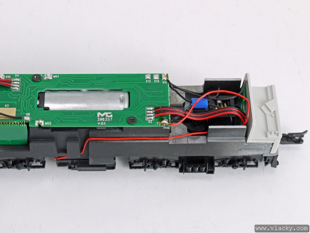 Přívody vedeme uvnitř lokomotivy až ke konci plošného spoje. Přívody jsou fixovány kapkou vteřinového lepidla.