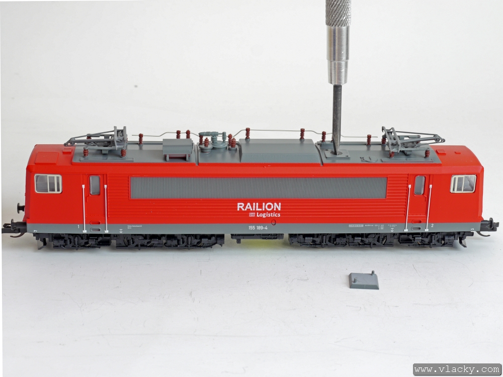 Na střeše lokomotivy vytáhneme imitaci krycí mřížky, pod kterou je schovaný jediný šroubek, který drží skříň lokomotivy s pojezdem.