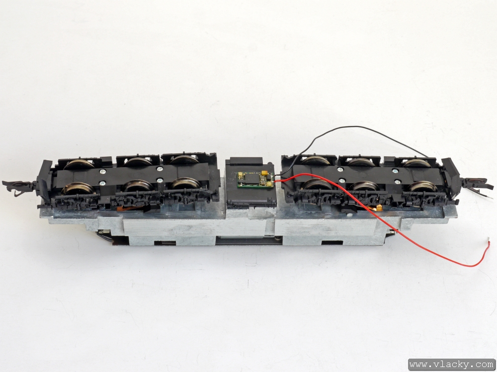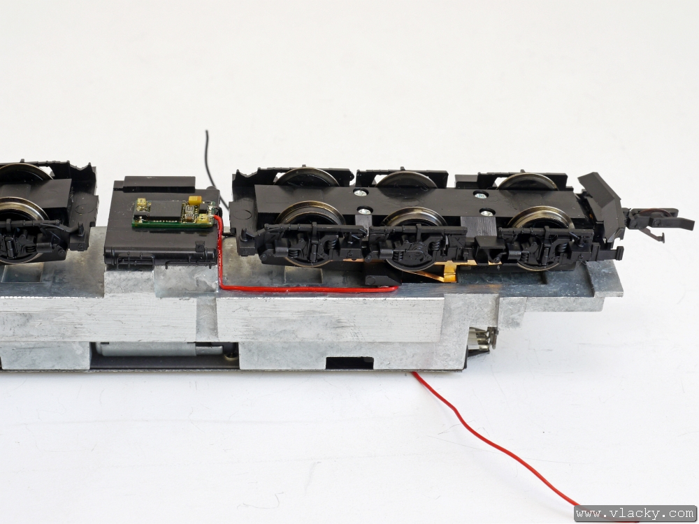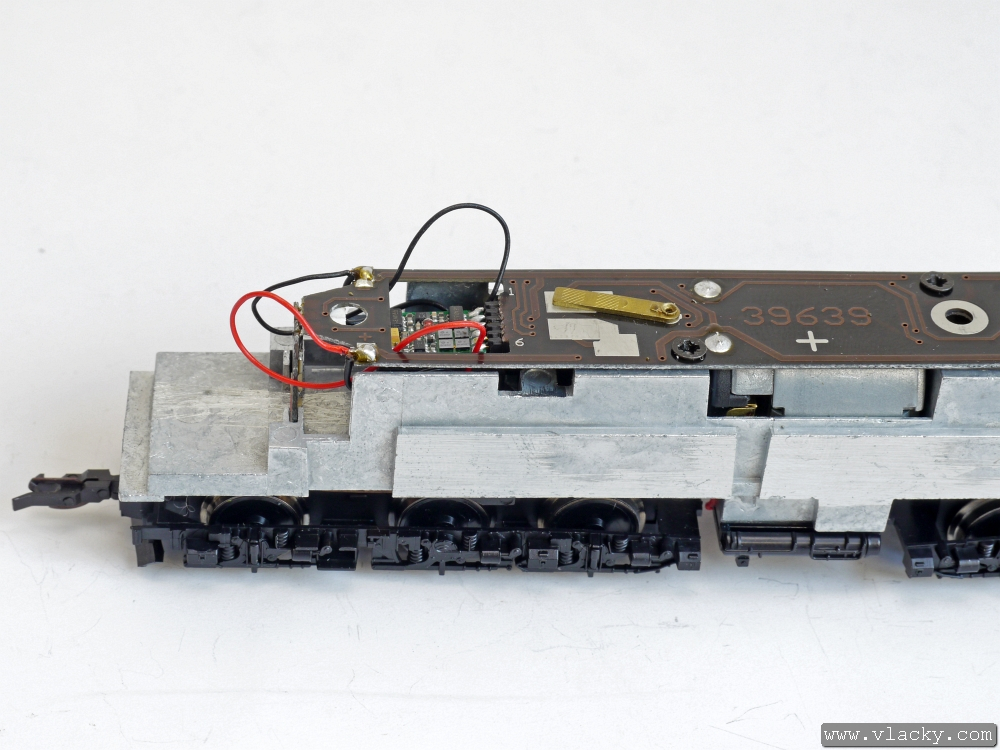 Přívody vysílače LISSY byly připájeny na plošný spoj vedle přívodů od podvozku lokomotivy. V tomto okamžiku je lokomotiva připravena k provozu.