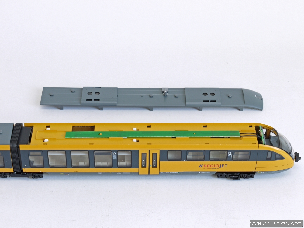 Pod střechou je schován plošným spoj s LED osvětlením interiéru a vlevo je otvor pro přístup ke konektoru NEM 651.