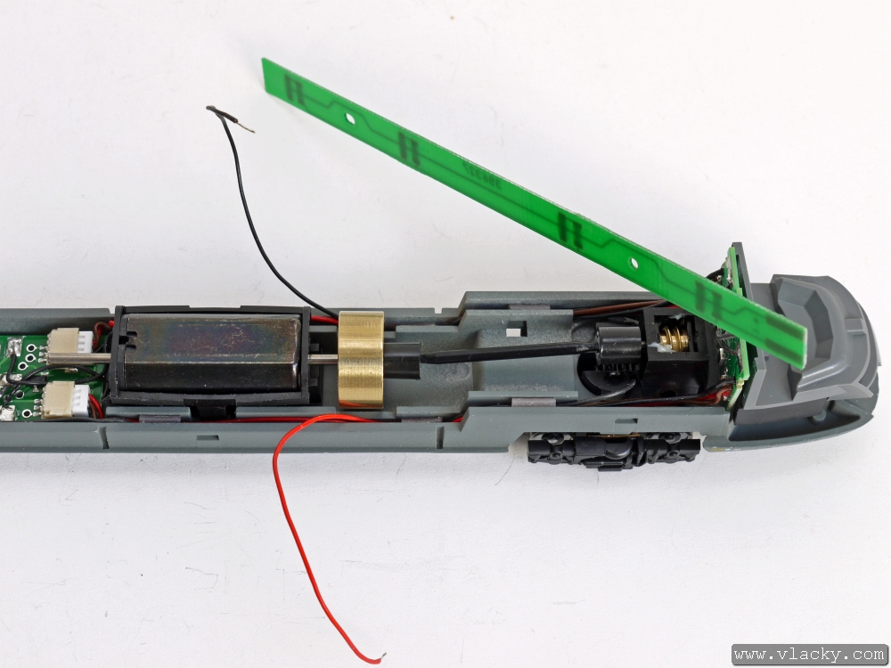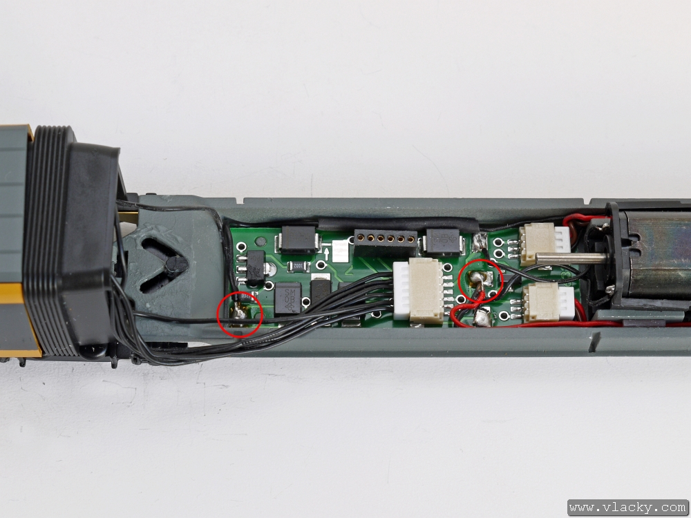 Vodiče připájíme na plošky, kde je přivedeno napájení od podvozků. Černý vodič je vlevo u měchů, červený vodič je vpravo. Před kompletací motorovou jednotku přezkoušíme a upravíme vodiče zpátky, aby nebránily zpětnému sestavení skříně.