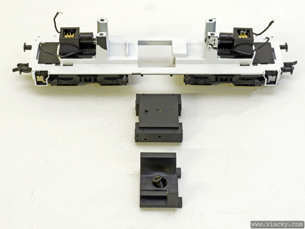 Uvolníme šroubek, který spojuje plastové uložení motorku s balastem (imitací nádrže) pod lokomotivou.