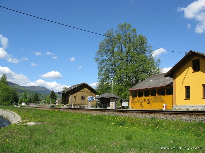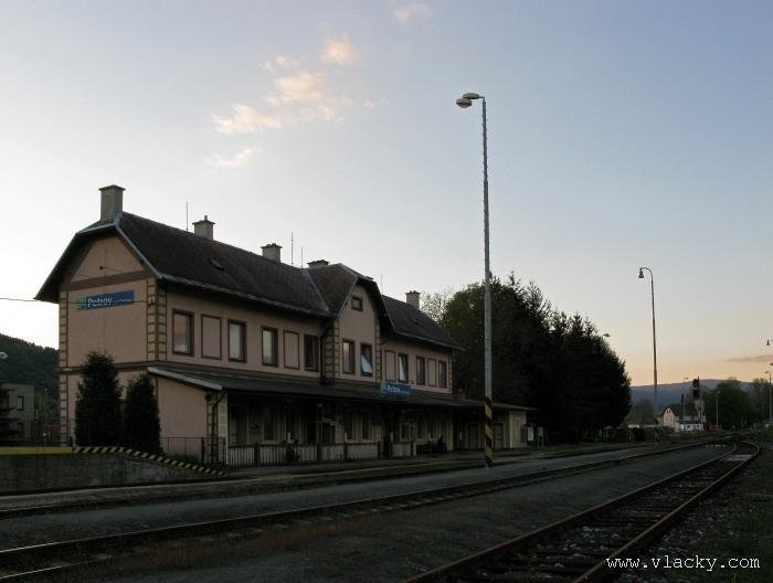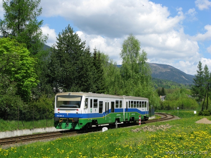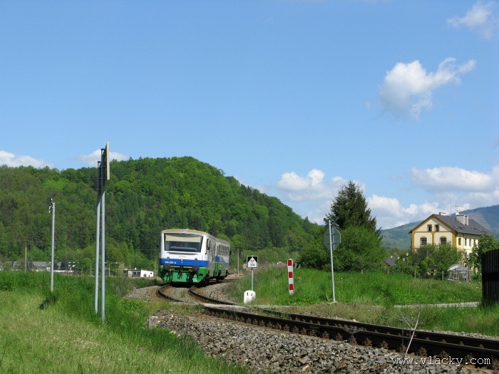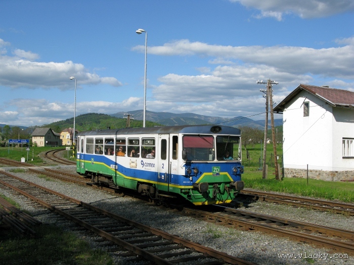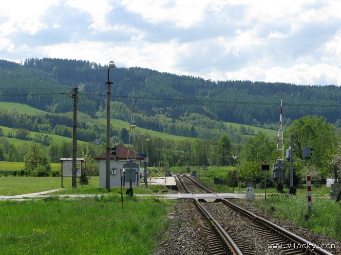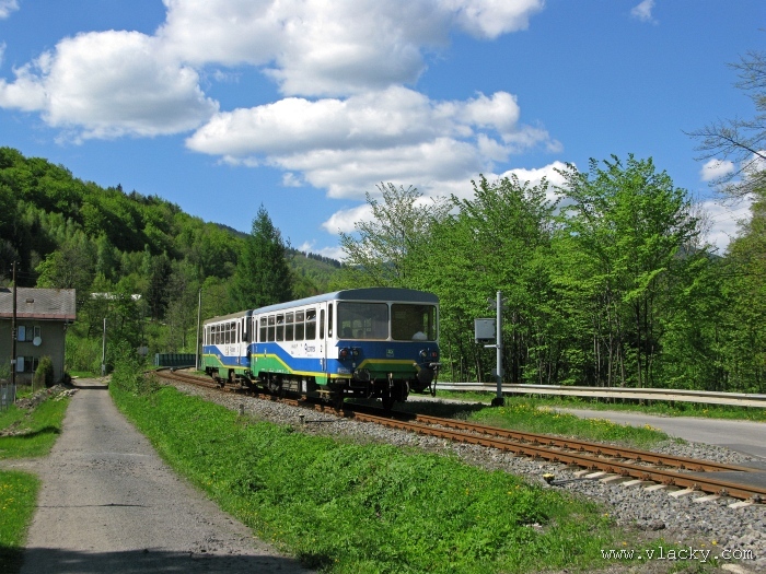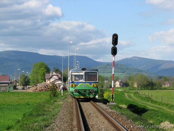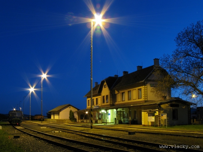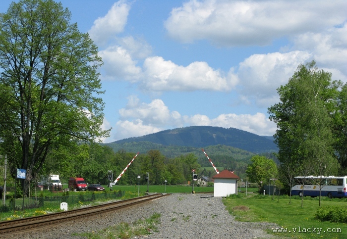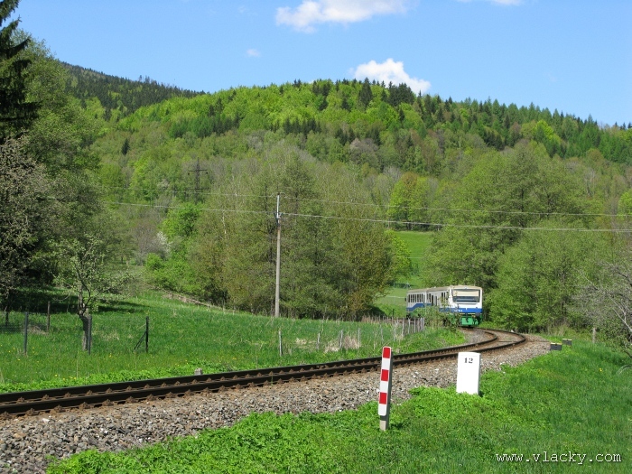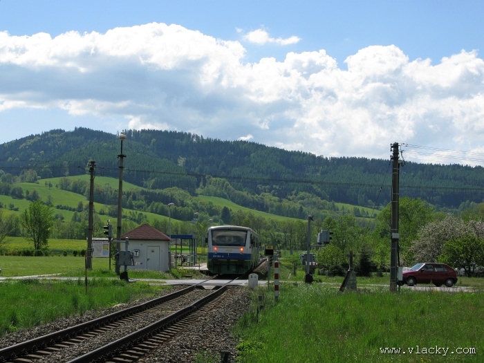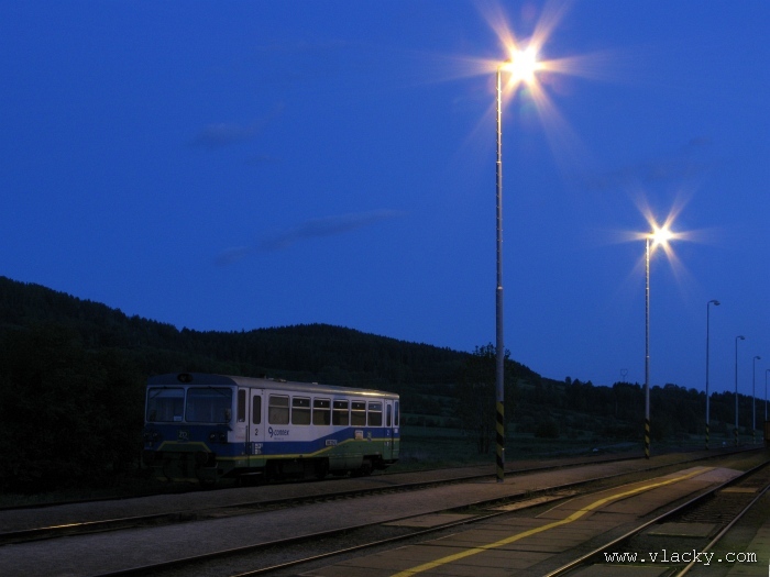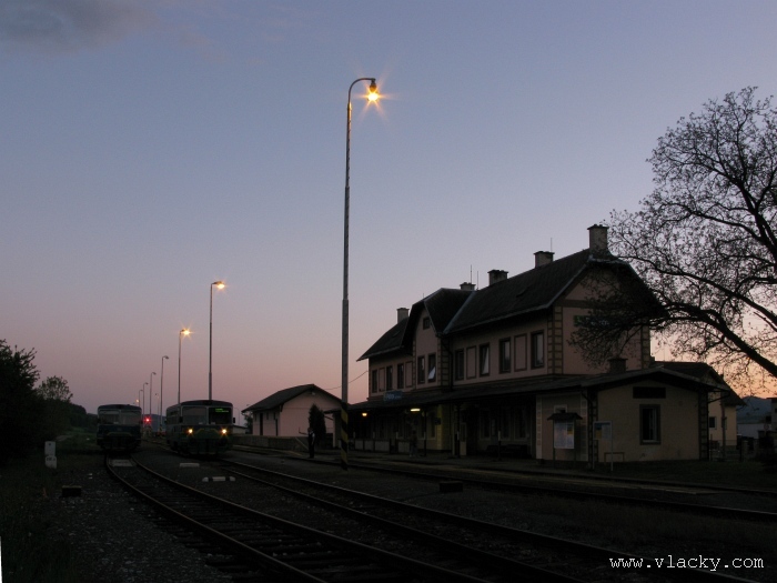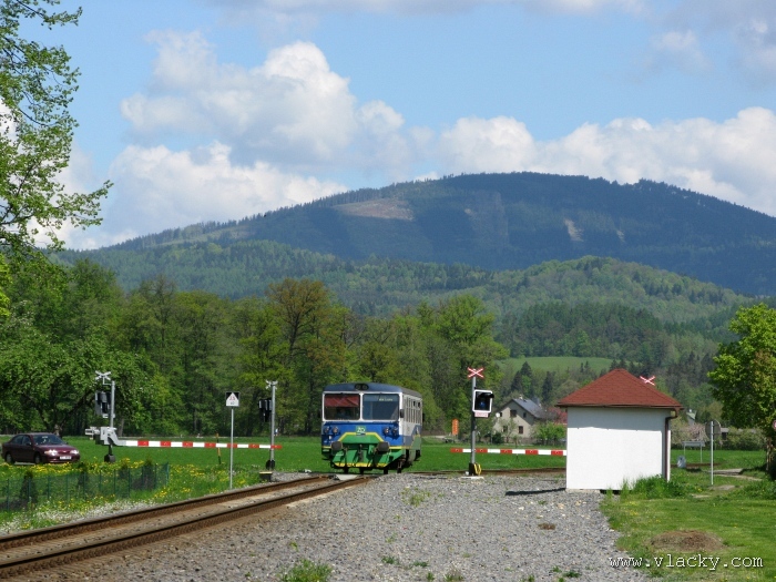 Svoji cestu jsem opět začal u trati mezi Petrovem na Desnou a Sobotínem. Ouha, nestačil jsem stativ připravit a záběr jsem pořídil z ruky. Nevadí, musím si lépe rozložit čas a tento záběr může sloužit jako referenční pro porovnání, jak vypadá takový záběr z ruky, protože následující už budou ze stativu. Přesunul jsem se na další stanoviště. Trať vede z Petrova nad Desnou mezi poli a loukami k mostu přes řeku Desná, následuje zastávka Rapotín zastávka, za ní přejezd se silnicí č. 44 spojující Šumperk s Jeseníkem a hned za ním trať pravotočivým obloukem stoupá k nedaleké zastávce Rapotín. Zde jsem počkal na průjezd Os 13763. Za pár minut za ním jede další Os 13765 z Velkých Losin do Šumperka. Na ten jsem si počkal na nástupišti nedaleké zastávky Rapotín v 11.16. Popojel jsem dále až za zastávku Loučná nad Desnou. Zde trať levotočivým obloukem hned dvakrát přetíná místní komunikaci se zabezpečenými přejezdy. Po průjezdu Os 13764 jsem stačil jsem dojet do následující zastávky Loučná nad Desnou-Rejhotice. Motorová jednotka Desná se již vracela z Koutů nad Desnou zpět jako Os 13767. Pokračoval jsem dále až na konečnou do Koutů nad Desnou, kde jsem si dopřál polední pauzu u kávy. Před vjezdem do stanice Kouty nad Desnou je opěrná zeď a nad ní vedoucí polní cesta. Odtud je hezký rozhled na vjezd do stanice Kouty nad Desnou. Samotná stanice je však bohužel skryta za stromořadím u řeky Desná. Počkal jsem na příjezd Os 13766 v 13.47 a potom jsem spěchal dále. Měl jsem vyhlédnuto další místo poblíž zastávky Loučná nad Desnou-Rejhotice. Souprava Desná se již vracela v 14.13 jako Os 13771. Na zastávce Loučná nad Desnou-Rejhotice jsem pořídil několik záběrů. Proti loňskému roku byla vlečková kolej definitivně snesena, zbytek zůstal pouze na přejezdu v místní komunikaci a za branou areálu. Další krátká zastávka byla v Loučné nad Desnou. Původní staniční budova byla ve srovnání s loňským rokem spravena a opatřena novou fasádou. Na další Os 13770 jsem počkal u přejezdu před Loučnou nad Desnou v 15.20. Jak jsem se dozvěděl později, motorový vůz pro neschopnost již dále nedojel a tato technická závada tak způsobila zpoždění i dalších vlaků. Postižen byl hned Os 13772, který jsem zastihl při zpáteční cestě na zastávce Rapotín zastávka. Vrátil jsem se zpět do Petrova nad Desnou. Os 23867 ze Sobotína nedojel, byl nahrazen autobusem. Os 13773 přijížděl do Petrova nad Desnou také se zpožděním. Protože na obrat v Šuumperku je jen 8 minut, zpožděn byl i Os 13774, na který jsem čekal v polích u vjezdového návěstidla do Petrova nad Desnou, a následující Os 13775 z Koutů nad Desnou, který v Petrově nad Desnou musel počkat na vracející se přípoj od Sobotína. Ale den ještě neskončil. Vrátil jsem se do stanice Petrov nad Desnou kolem 20. hodiny, abych zkusil ještě noční focení. Po západu slunce měnila obloha postupně svoji barvu z nevýrazných odstínů krátce po soumraku, přes krásně temně modrou až po neproniknutelnou černou. Dá se říci, že krásně temně modrá obloha pro focení vydrží tak půlhodinku. Pochopitelně na stativ jsem upevnil fotoaparát, protože expoziční časy se postupně prodlužovaly od 5s až do 15s. Na noční akce by se hodily tak stativy dva, druhý pro kameru. Poslední záběr jsem už nestačil exponovat a z odjíždějícího Os 13782 zůstaly jen obrysy a stopy po reflektorech.